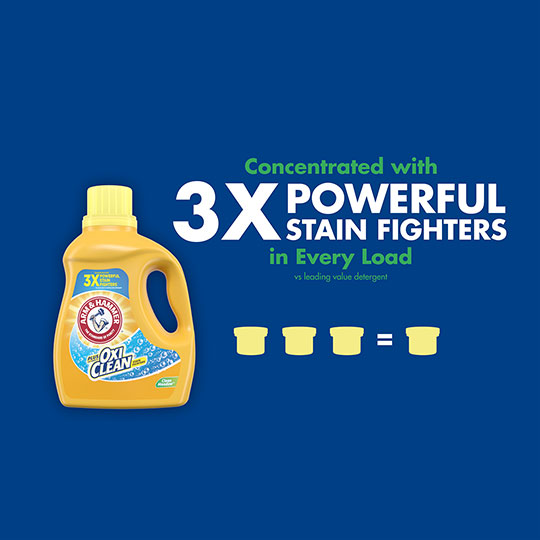 - DEEP CLEANING ARM & HAMMER DETERGENT IS POWERED BY OXICLEAN STAIN FIGHTERS This supercharged stain-fighting liquid concentrated laundry detergent powers out dirt and odors using OxiClean, America's #1 stain remover additive brand* (*based on units sold)