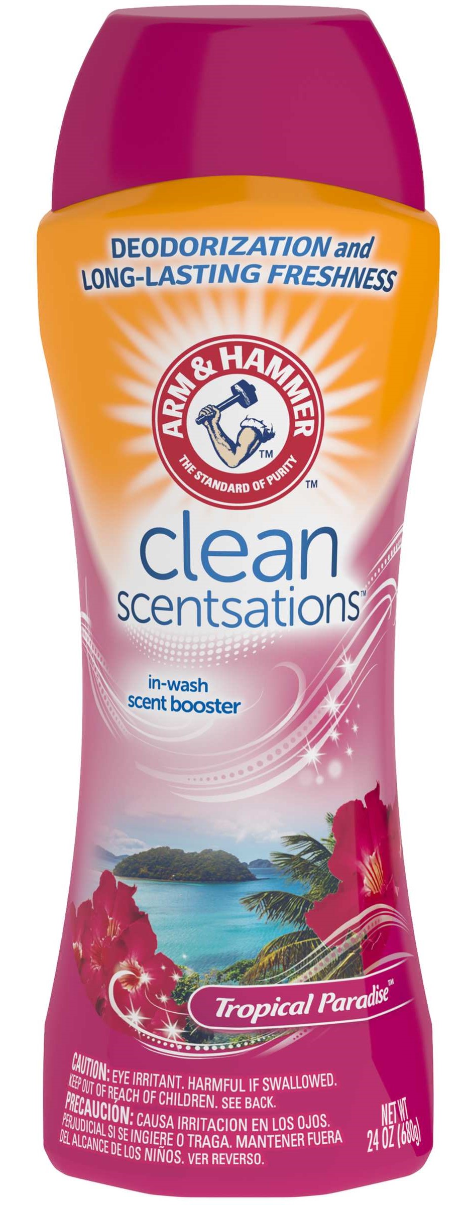 Clean laundry is a beautiful thing. You can bring that level of clean to your laundry detergent with the lasting freshness of ARM & HAMMER Clean Scentsations Laundry In-Wash Scent Booster in Tropical Paradise scent. Tiny scent crystals in this in-wash scent booster deliver a delectable blend of sun-ripened fruity florals, while vibrant citrus shines through. A warm, gentle tropical breeze leaves a lasting trail of freshness, invoking an inviting fragrance of basking in tropical sunshine is what you get with these laundry scent boosters for the washer. This laundry scent booster is blended with the trusted power of odor-absorbing ARM & HAMMER Baking Soda for freshness. To power up your laundry routine, use this in-wash scent booster with ARM & HAMMER Tropical Paradise Liquid Laundry Detergent concentrated with 2X powerful stain fighters in every drop vs leading bargain detergent, for a powerful clean plus a boost of long-lasting tropical freshness in every load.