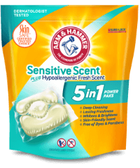ARM & HAMMER is proud that Sensitive Skin Free & Clear, Sensitive Skin Plus Fresh Scent, and now Sensitive Scent 5-in-1 Power Paks have been certified by the SkinSAFE Trusted Choice program, which requires manufacturers to provide scientific and clinical evidence to support product use and safety. So you can feel confident that you’re using the right products for your sensitive skin.