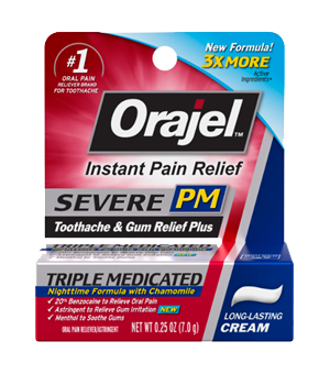 Orajel™ Crema Triple Medicada para el Alivio del Dolor Agudo de Dientes y Encías PM brinda alivio instantáneo para el dolor bucal agudo y encías adoloridas. Su fórmula nocturna brinda 3 veces más ingredientes activos en comparación con otros productos para el dolor bucal medicados con un solo ingrediente, proporcionando así un alivio rápido y dirigido específicamente a la zona de dolor, para que duerma toda la noche.