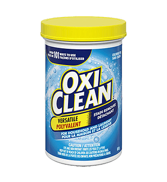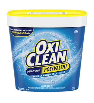 OxiClean™ est un détachant polyvalent en poudre qui est activé une fois mélangé à de l’eau (l’eau tiède ou chaude fonctionne le mieux). L’oxygène est relâché et cible les taches plutôt que le tissu. Il déloge ainsi de nombreux types de taches tenaces des vêtements, tapis, tissus d’ameublement et surfaces dures lavables à l’eau à l’intérieur comme à l’extérieur de la maison.